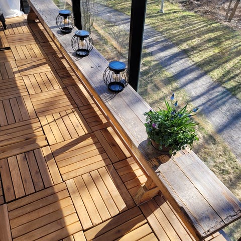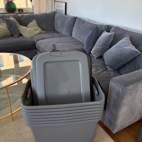 Sittbänk som vi haft som förvaring. Haft backar med leksaker i.