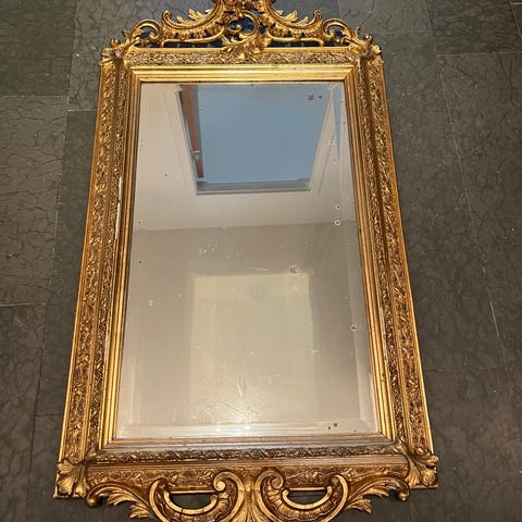Vacker spegel i förgylld rokokostil säljes. Importerad från USA troligen tidigt 50-tal och ursprungligen såld via konst- och ramavdelningen på det kända varuhuset Woodward & Lothrop i Washington D.C.