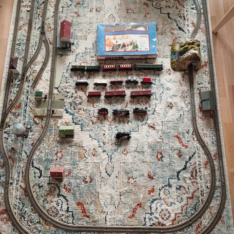 10 digitala lok,många godsvagnar,3 sovvagnar,22 el- växlar,ca 50 meter C-rälså,digital transformator, en vit trafo till växlar