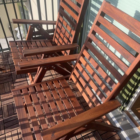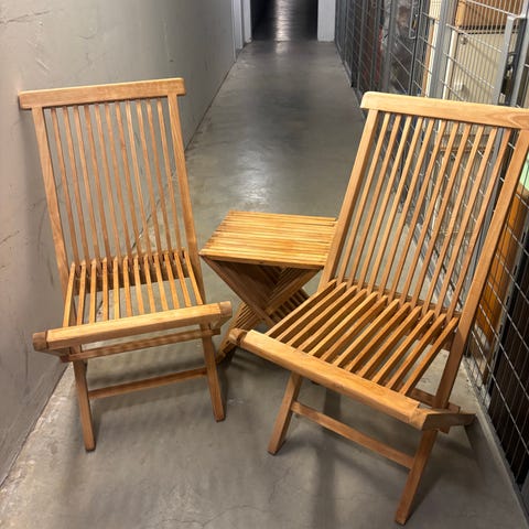 Däckstolar i teak med ribbad sits och ryggstöd. Stolarna har fotstöd för bekvämare sittställning utomhus. Passar för uteplats, altan eller trädgård. Utförande i teak som kan användas som de är eller oljas efter önskemål. Dynor i beige tyg finns varav den ena har en liten reva som behöver sys/lagas.