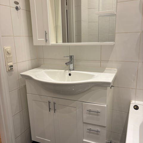 Säljer LILLÅNGEN badrumskommod från IKEA i vitt, med metallben. Passar under fristående tvättställ. Ingår ett hyllplan som går att flytta.