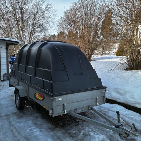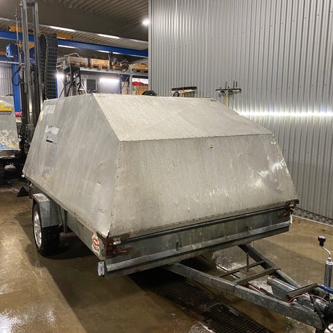 Släpvagn med grå kåpa. Kåpan är uppfällbar och ger väderskyddat lastutrymme. Flak med trägolv och en axel. Lämplig för transport av gods som behöver skyddas mot väder och vind.