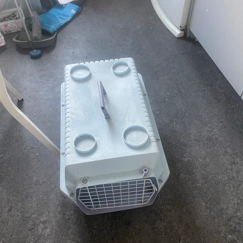 Kattbur 50x60x42cm, hopfällbar, rosa metallic. Fem matskålar, toalåda med höga kanter, spade, kloklippare, pälsborste, halsband/koppel. Priset gäller samtliga delar.