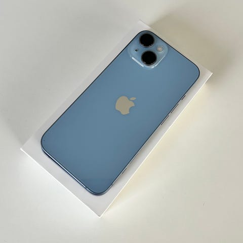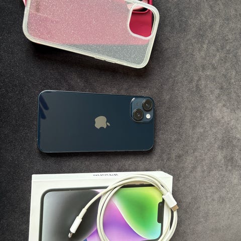 Apple iPhone 14 mobiltelefon med 128 GB lagringsutrymme i blå färg.