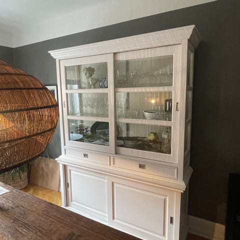 Kökshylla med glashyllor, lådor och bokställ under lådorna.