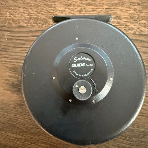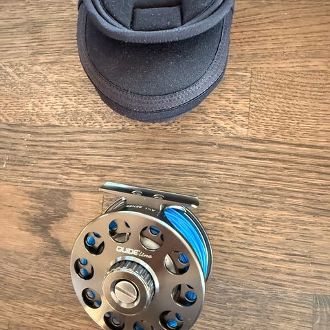 Loop flugrulle i svart utförande. Rullen har perforerad spole med synlig fluglina i tvåfärgad orange/gul nyans.