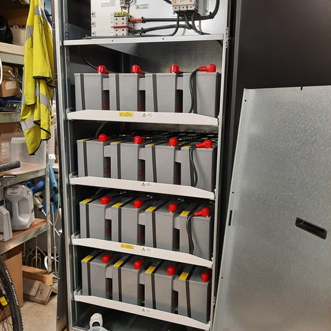Batteripaket med tillbehör. Bilden visar två batterier samt ytterligare komponenter som kan ingå i ett kit, exempelvis för reservkraft eller energilagring. Exakta specifikationer, kapacitet och modellbeteckning framgår inte av underlaget och bör kontrolleras vid behov.