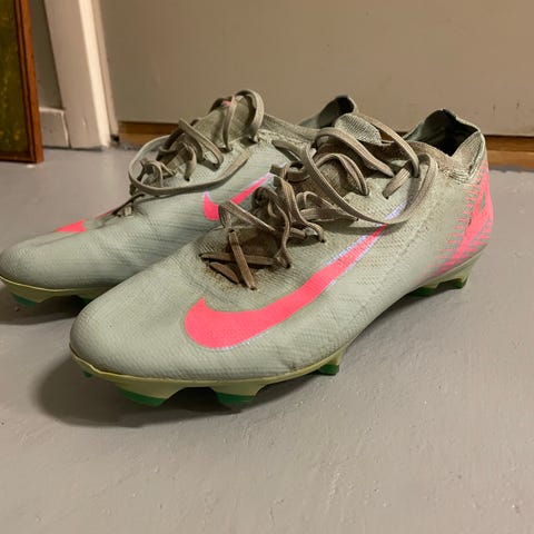 Nike Air Zoom Mercurial. Fotbollsskor i storlek 43. Skorna är vita med blå detaljer och har fasta dobbar.