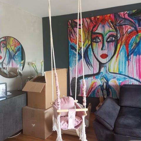 gunga för barn i rosa tyg med trädetaljer. Gungan hängs upp med kraftiga rep och har sittdel med ryggstöd och frontrem för att barnet ska sitta stadigt. Passar för inomhusbruk där det finns lämplig upphängningspunkt i tak eller dörrkarm. Medföljer lösa kuddar i matchande rosa tyg som kan användas som extra stöd eller dekoration i gungan eller i barnrummet. Materialet består av textil, rep och trädelar. Kontrollera alltid upphängning och viktgräns enligt tillverkarens anvisningar innan användning.