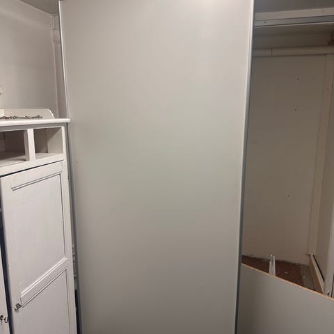 Hej säljer nu tre gråa skjutdörrar och garderobsinredning med trådbackar, skenor och hyllplan i vit färg. Består av flera trådbackar i metall, vertikala skenor samt plana hyllor. Passar för förvaring i garderob eller klädkammare. Alla delar är lösa och kan anpassas efter befintligt utrymme. Måtten är 233x100 cm.
