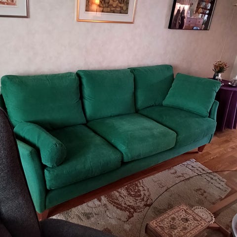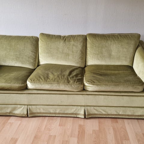 Otrolig fin retro soffgrupp i limegrön plysch. Vändbara dynor och fullt fungerande, ej nedsuttna. Små dolda småskador som inte syns utanpå, endast när man lyfter på dynorna. Köpt på Mio runt 1972. 3-sits 2m, 2-sits 1,66m och fåtölj 1m.