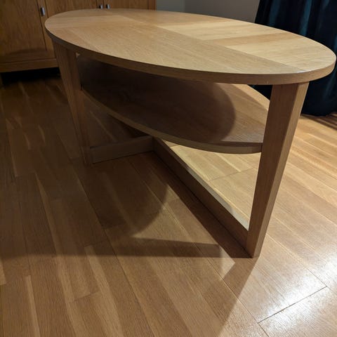 Fint och praktiskt vardagsrumsbord med hyllor & 2 fina puffar för extra sittplats.