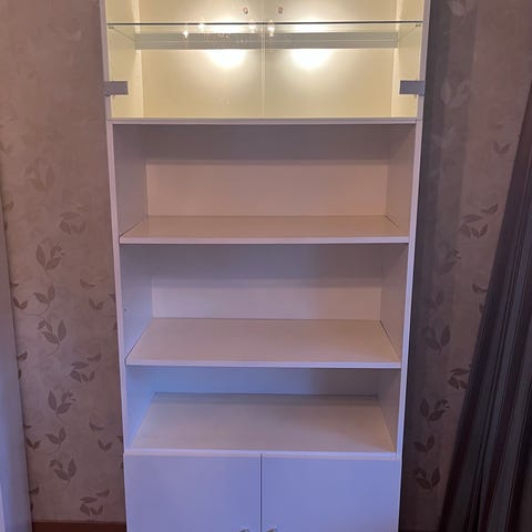 Säljer stilrena vitrinskåp i vit design med glasdörrar och glashyllor. Perfekta för att visa upp porslin, glas, böcker eller prydnader på ett snyggt och organiserat sätt.