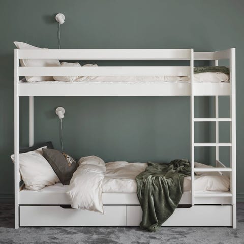 IKEA loftsäng i vit trä. Sängen har en övre sovplats med skyddsräcke och en nedre sovplats, samt en integrerad stege för åtkomst till övervåningen. Passar för barn eller ungdomar och är utformad för att maximera användning av utrymme i rummet.