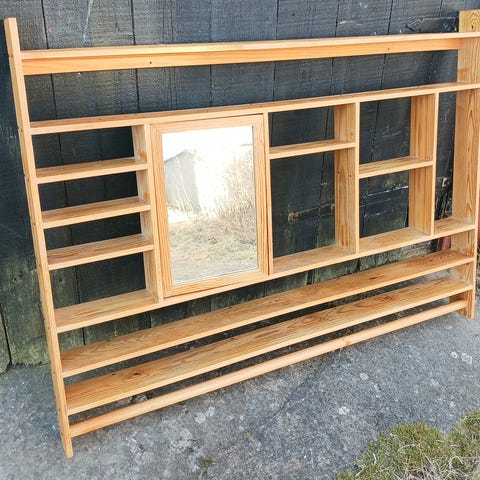 Skandinavisk retrobokhylla i tre sektioner, sannolikt tillverkad under 1950- eller 1960-talet. Osäker på träslag men bör vara i teak, mahogny eller valnöt. B2.79m, H1.66m, D45cm