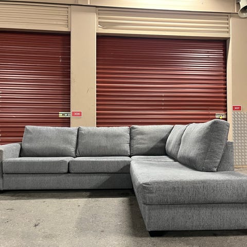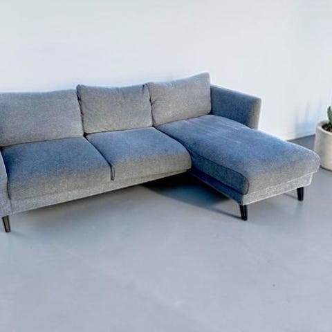 Mörkgrå soffa i sammet med divan , Modellen Stockholm och kommer från Soffa Direkt .