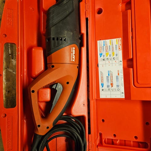 Hilti SR 4-A22 tigersåg. Batteridriven tigersåg i orange och svart utförande. På bilderna syns tillhörande Hilti-laddare. Sågen är avsedd för kapning och rivningsarbeten i trä, metall och andra material beroende på val av blad. Passar för användning vid bygg-, renoverings- och underhållsarbete där en portabel såg behövs.