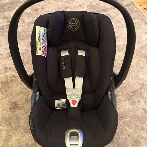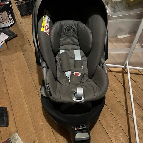 Cybex babyskydd bilbarnstol för barn upp till 13 kg. Bas, myggnät, regnskydd och adaptrar till Emmaljunga barnvagn medföljer. Självklart okrockat! Uttaget 2023.