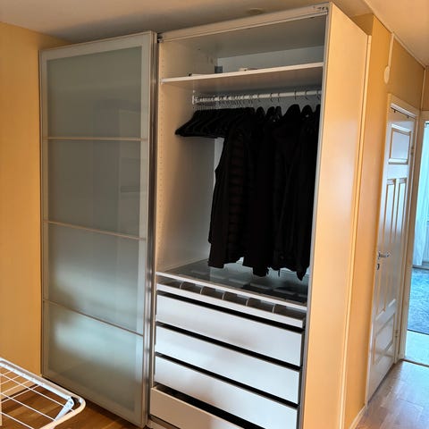 Skänker bort ett funktionellt garderobssystem i metall/silverfärg från Elfa. Skjutdörrar i frostat glas. Systemet är flexibelt och kan monteras efter behov. Det finns ytterligare 2 trådkorgar som följer med som ej är med på bilden, i övrigt följer allt som ses på bilden med.