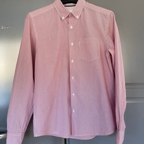 En röd och blå rutig skjorta med en liten ficka på bröstet. Den har en knappstängning framtill och långa ärmar. På etiketten står det ”Hope Faith & Strength” och ”157. Iconic Sport United Supply”.