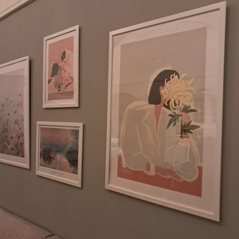 Vajerupphängning med klämmor för tavlor. Består av transparent vajer med metallklämmor samt vita krokar för tavellister.
