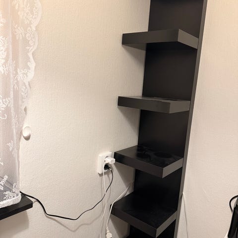 Ikea hörnhylla i mörk träfinish. Hyllan är utformad för att stå i ett hörn och har flera öppna hyllplan för förvaring eller exponering av föremål som ljus, dekorationer och mindre prylar. Passar i vardagsrum, sovrum eller hall där man vill utnyttja hörnutrymme på ett platsbesparande sätt. Materialet framstår som trä eller träfaner med mörk yta. Design attributet Carl Malmsten är angivet men modellen framgår inte närmare av bilden.