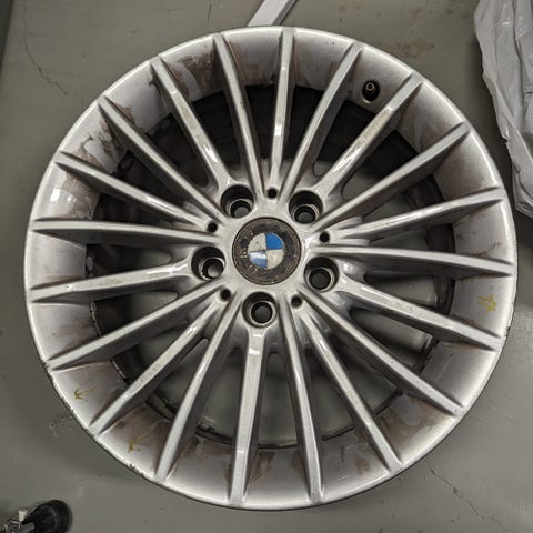 4st BMW alu-fälgar varav en har en spricka på insidan (se bild) vilket gör att den pyser ut luft.