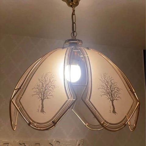 Taklampan är en vintagearmatur, tillverkad av glas och mässingsfärgad metall. Fint skick!