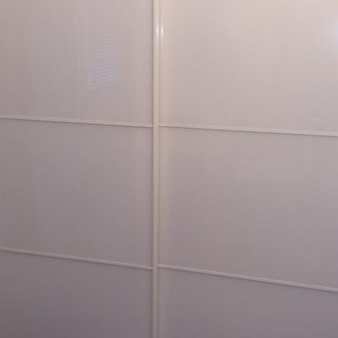 IKEA HAUGA garderob med skjutdörrar i vit färg. Vi har bytt ut handtagen till guldiga.
