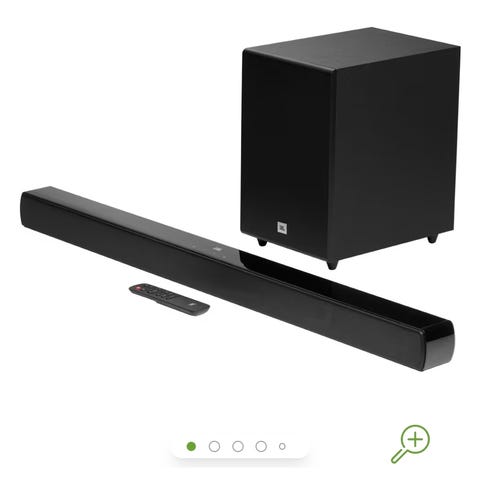 JBL soundbar med trådlös subwoofer och två bakhögtalare i svart utförande. Systemet består av en lång, låg soundbar för placering framför tv:n, en fristående subwoofer för basåtergivning samt två mindre högtalare som kan användas som bakhögtalare för surroundljud. Lämpligt för användning tillsammans med tv, film, spel och musik i vardagsrum eller liknande miljöer.