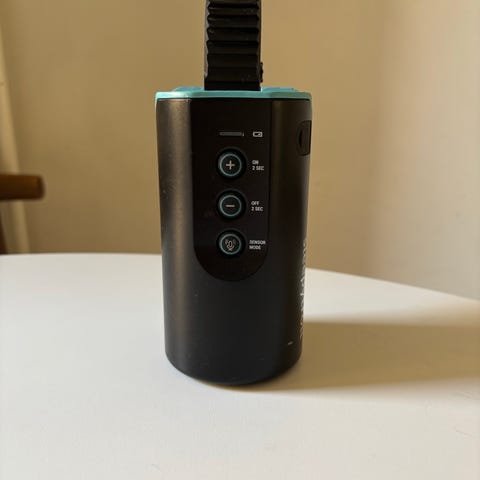 Sleepytroll vagnvagga i svart och blått utförande. Enheten fästs på handtaget till barnvagn eller liknande med inbyggd rem. På sidan finns knappar för start, stopp och justering av funktioner. Produkten är avsedd för att vagga barnvagn automatiskt och kan användas inomhus eller utomhus enligt tillverkarens anvisningar.