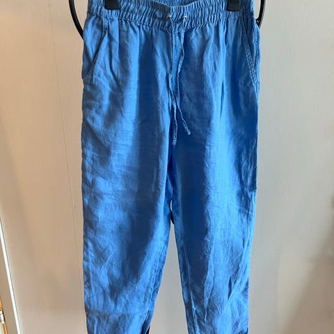 Ett par blå byxor med en avslappnad passform. Byxorna har en resår i midjan och ett knytband för justering. De är utrustade med fickor i sidorna och har en uppvikt kant vid bensluten. Detaljerade sömmar i en kontrasterande färg ger byxorna en fin finish.
