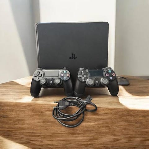 Sony Playstation 4 spelkonsol i svart färg. Konsolen levereras med två handkontroller i olika färger, en vit och en flerfärgad, samt tillhörande kablar som syns på bilden. Lämplig för spel, film och annan underhållning som stöds av Playstation 4-systemet.