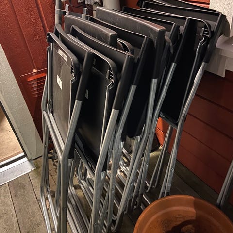 säljer 26 stycken i hoppfällbara stolar. Några är lite slittna men funkar bra.