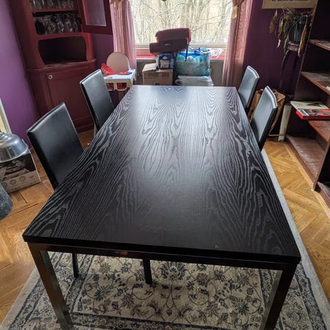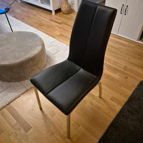 Matgrupp Säljs pga Flytt bestående av ett rektangulärt matbord och 6 stolar. Stolarna har skön o svart sits och ryggstöd i konstläder med kromfärgade ben.