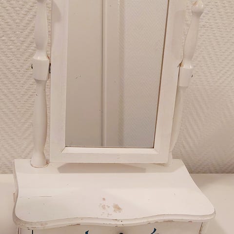 Leksaker sminkbord för barn i trä. Bordet är i rosa och vitt med spegel och prickdetaljer. Framsidan har en utdragbar låda med knopphandtag för förvaring av småsaker. På bordsskivan finns tillbehör i form av en liten borste och en handhållenspegel i matchande färg. Passar som leksak och inredningsdetalj i barnrum.