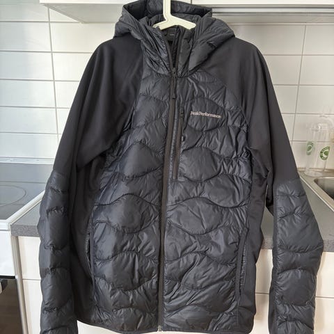 Peak Performance dunjacka för herr i storlek L. Jackan är svart och fylld med dun, vilket ger god värmeisolering. Modellen har huva och dragkedja framtill. Passar som ytterjacka vid kallare väder och för vardagsbruk eller utomhusaktiviteter.