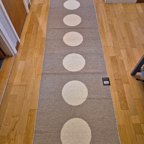 Pappelina plastmatta med stjärnmönster i svart och vitt. Mattan är vävd i plast och har ett vändbart mönster med kontrasterande stjärna på respektive sida. Passar exempelvis i hall, kök eller barnrum och är lätt att torka av och hålla ren.