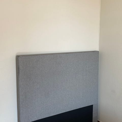 Sänggavel i ljusgrå textil med rutquiltat mönster. Utrustad med avtagbar cylindrisk nackkudde fäst med rem på ovansidan. Passar som huvudgavel till säng och ger stöd vid sittande läge, till exempel vid läsning eller tv-tittande i sängen.