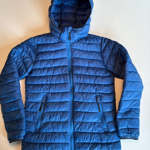 Blå lättviktsjacka med avtagbar huva från Peak Performance. Vadderingen består av 90% dun och 10% fjäder. Jackan har en svart dragkedja och en normal och smidig passform. Fickor med dragkedja finns i sidan. Märkets logga är broderad och placerad på ärmen.