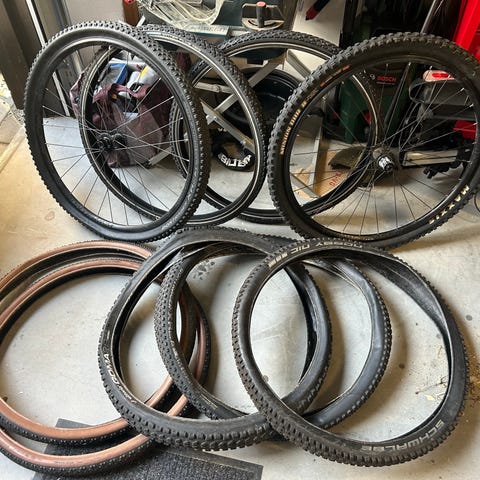Cykeldelar bestående av flera kompletta hjul och lösa fälgar i blandade storlekar samt flera framgafflar av olika typer. Säljes som ett paket eller enstaka delar, bud med rätt att neka