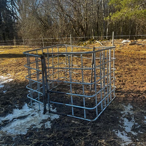 Rund foderhäck i galvaniserat stål, avsedd för utfodring av får