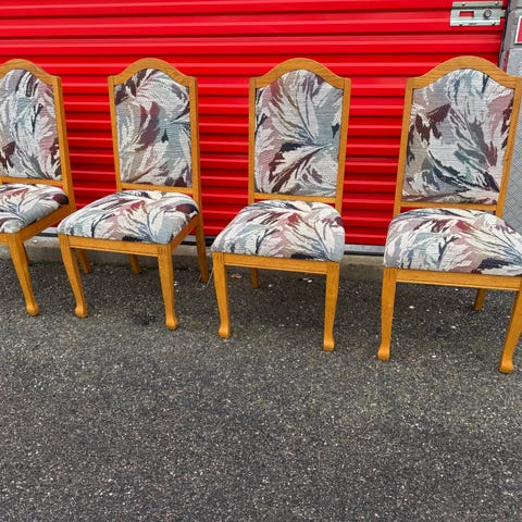 Stommen är gjord i valnöt, den har en karaktäristisk spjälrygg och en lös, stoppad sits. Nyklädda sitsar.