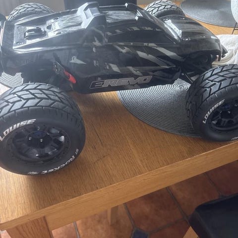 Traxxas RC-bil för terrängkörning i orange kaross. Bilen har grovmönstrade däck, takräcke och detaljerad kaross med flera dörrar och fönster. Chassit är utrustat med elektrisk motor, elektronik och kablage för radiostyrning. Lämplig för körning utomhus på ojämnt underlag som grus, jord och stenig mark.