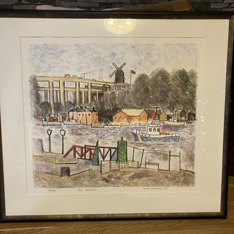 Ett inramat träsnitt föreställande gatuvy från London av konstnären Erik Wessel-Fougstedt.