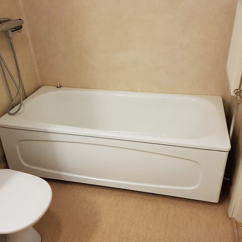 Badkar i vitt utförande. Rektangulär modell med frontpanel. Passar för installation i badrum med standardmått 170 cm där ett fristående eller inbyggt badkar önskas. Ytan är slät och anpassad för normal användning i hemmamiljö.