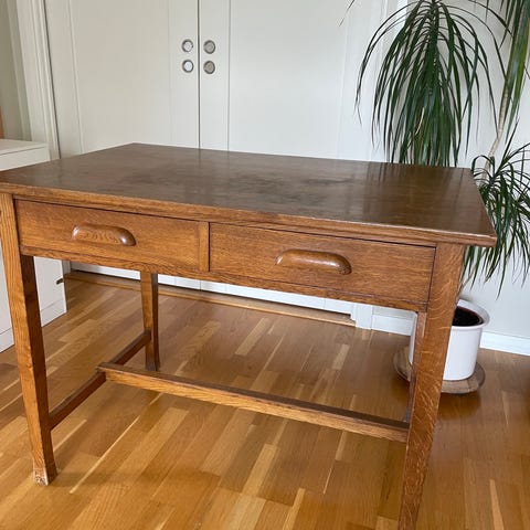 Säljer ett robust och charmigt skrivbord i massivt trä med vacker patina och klassiska svarta handtag. Stabilt och välbyggt med flera rymliga lådor som ger gott om förvaring.