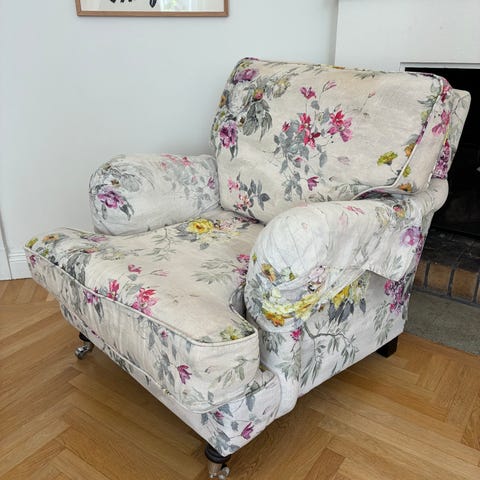 Fåtölj med pall. Skön. Mycket litet använt. Har däremot legat i solen och tyget bleknat.