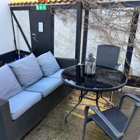 Utemöbler består av soffgrupp med natur konstrotting svart från Ekeby möbler.
