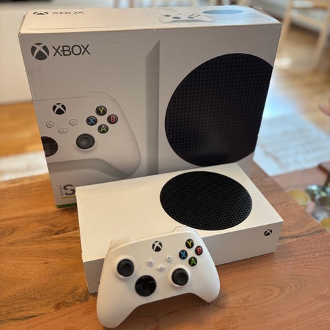 Microsoft Xbox Series S spelkonsol vit samt en skärm